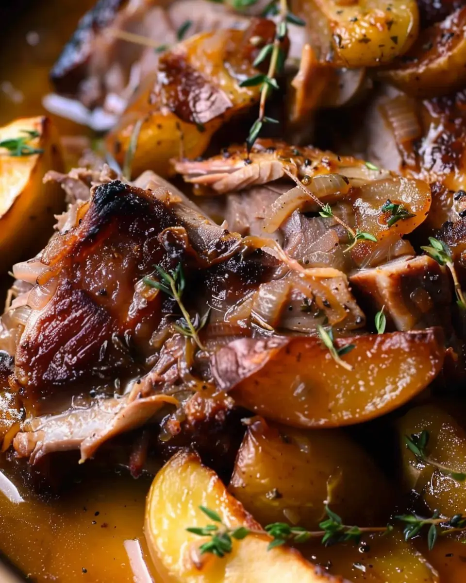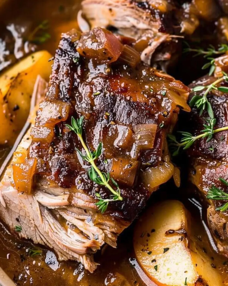 A comforting dish featuring pork shoulder braised with apple cider for a rich and flavorful meal.