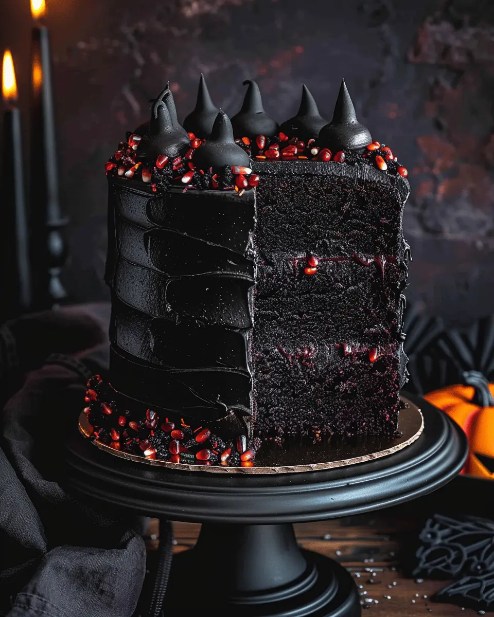 Indulge in the rich flavors and festive spirit of this Black Velvet Halloween Cake, perfect for your celebration.