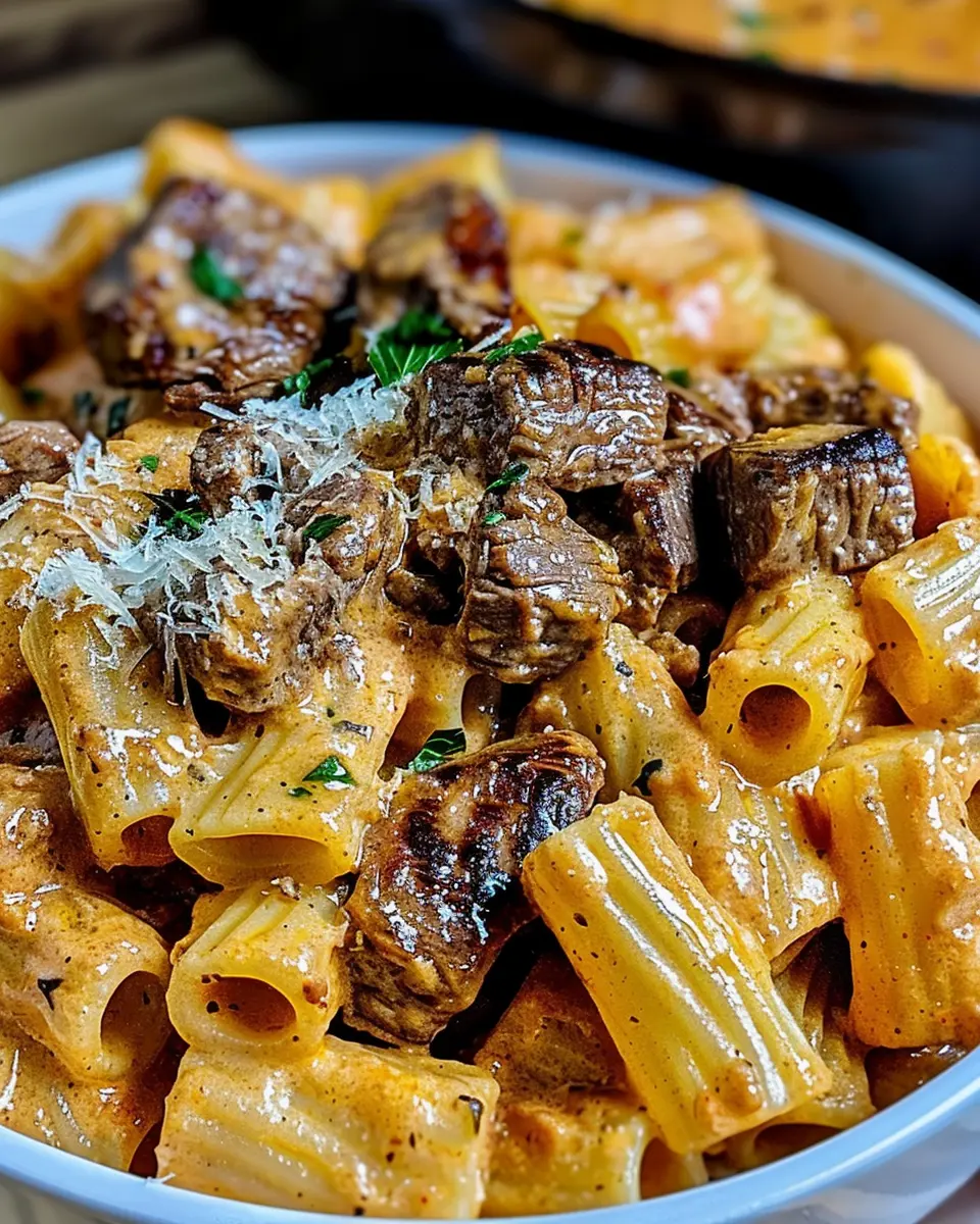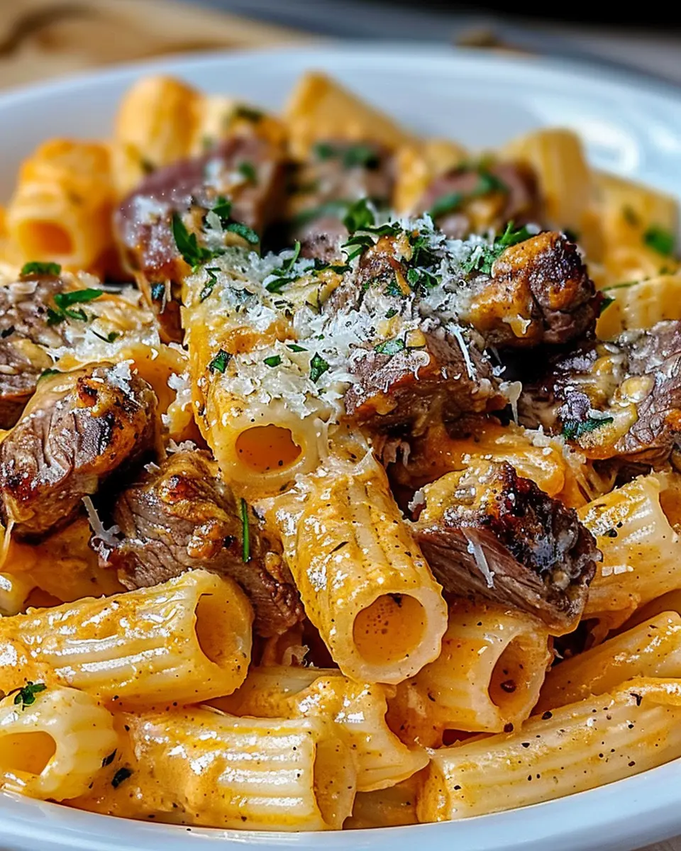 Indulge in this rich and flavorful dish featuring Cajun steak tips coated in a creamy cheesy rigatoni parmesan sauce.