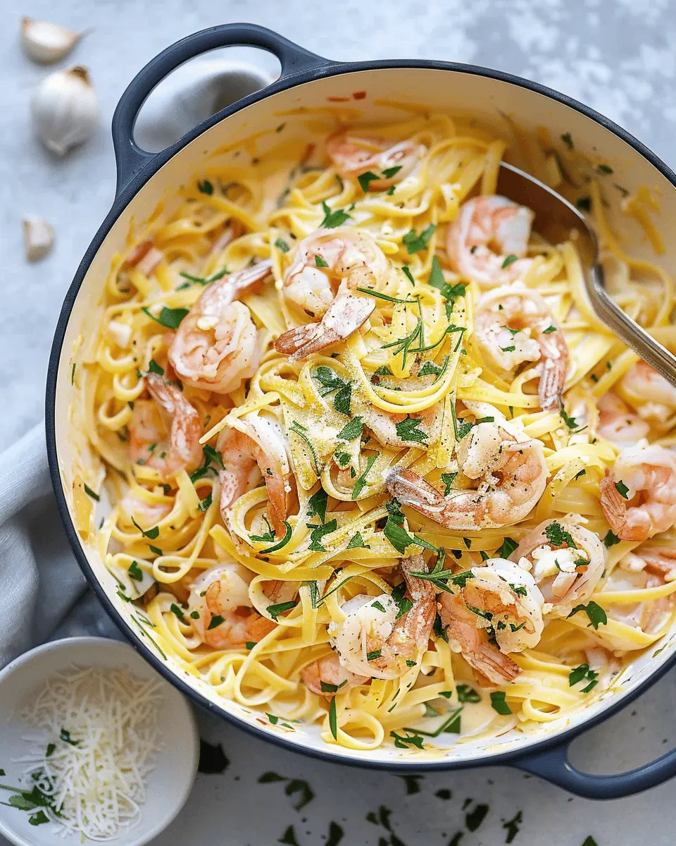 Finish off with a sprinkle of fresh parsley or basil and a generous shower of grated Parmesan cheese. Your creamy shrimp pasta is now ready to devour!