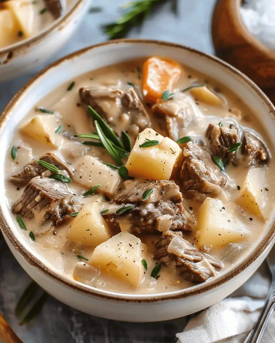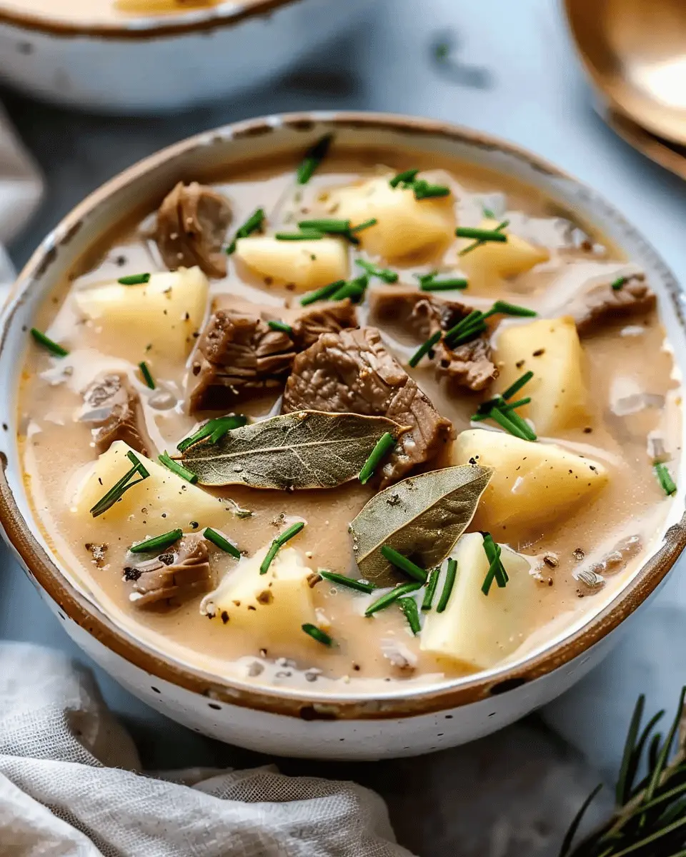 A rich and hearty soup combining tender steak and creamy potatoes, perfect for a comforting meal.