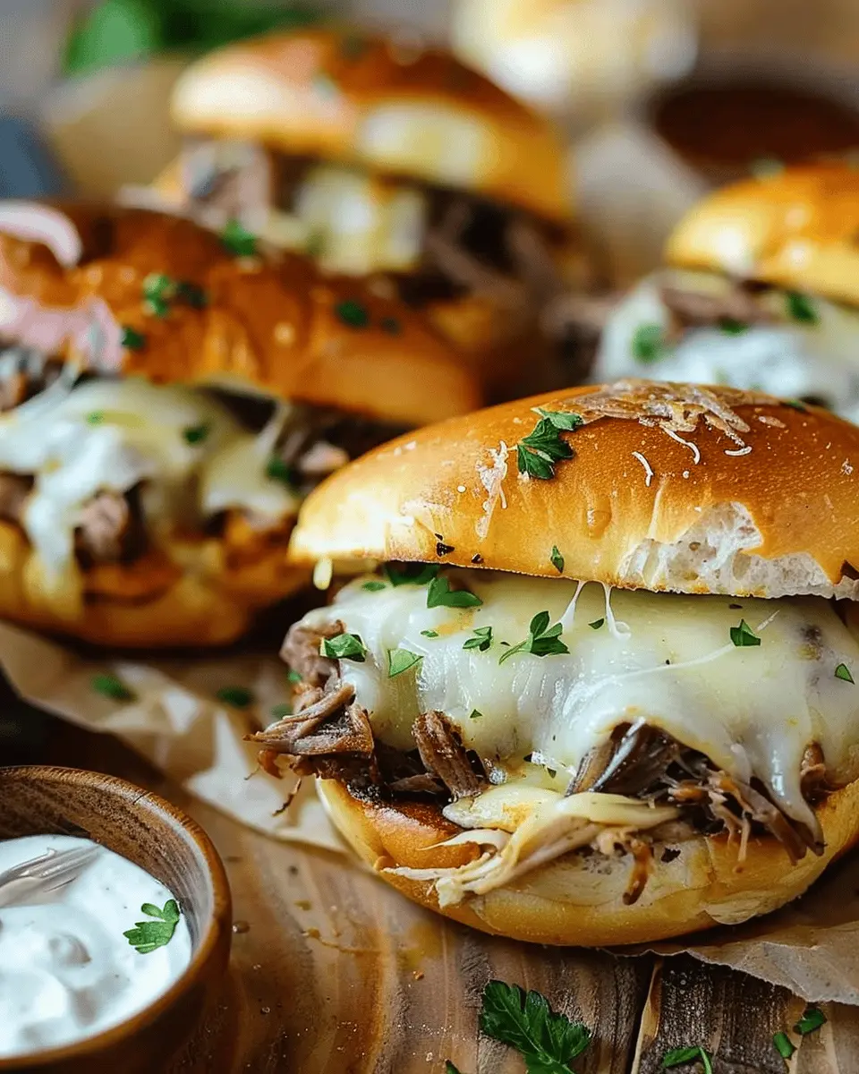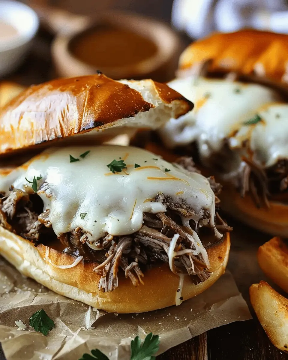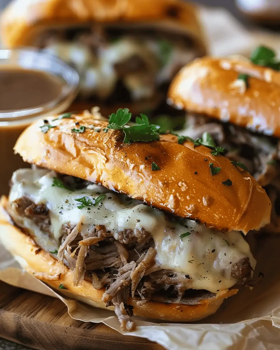 To serve, ladle some of that rich, flavorful broth (au jus) into small cups for dipping. Encourage your guests to dunk their sandwiches into the broth for that classic French dip experience. Trust me; they won’t be able to resist!