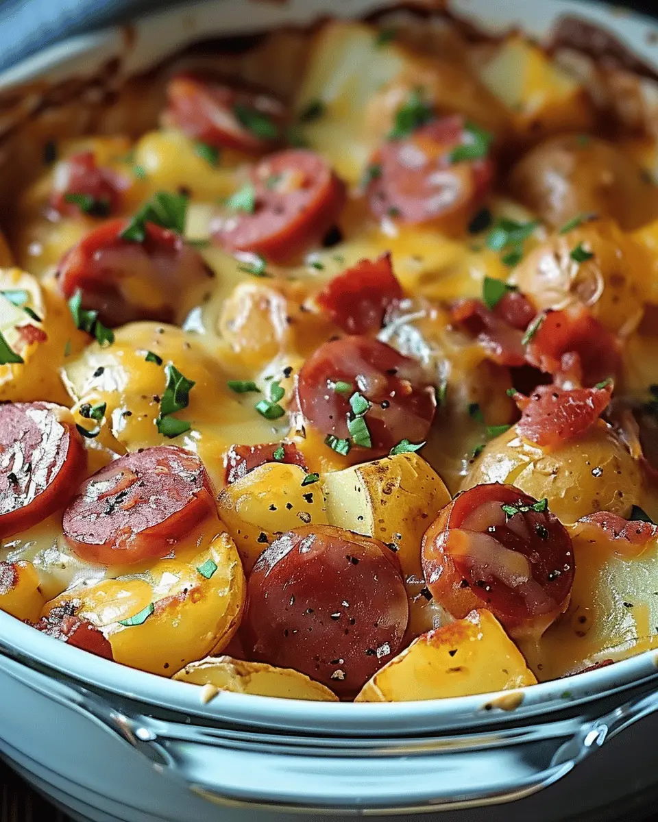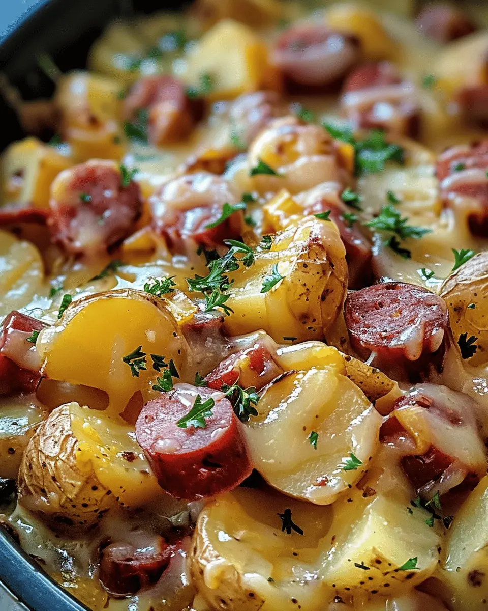 Crockpot Cheesy Potatoes and Kielbasa is the epitome of comfort food, blending creamy, cheesy goodness with savory turkey bacon and chicken ham. This dish not only offers rich flavors but also strikes a balance between convenience and satisfaction. With minimal prep time, you can set it and forget it, making it the perfect weeknight meal when your schedule is tight.