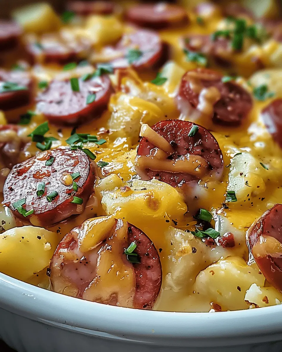 A delicious and comforting dish made with cheesy potatoes and savory kielbasa, perfect for family dinners.