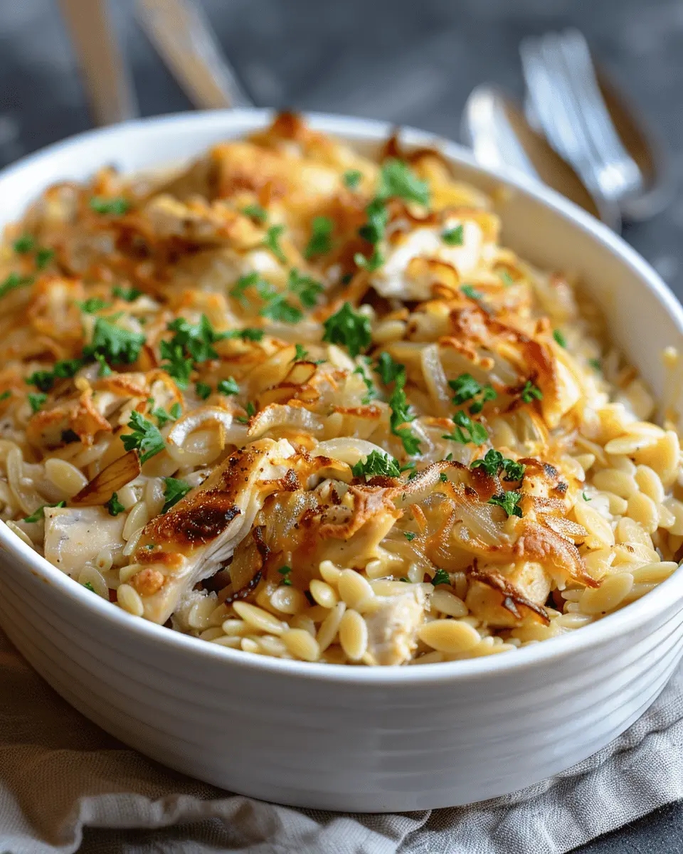 Warm and comforting, this French Onion Chicken Orzo Casserole combines the rich flavors of French onion soup with tender chicken and hearty orzo pasta.
