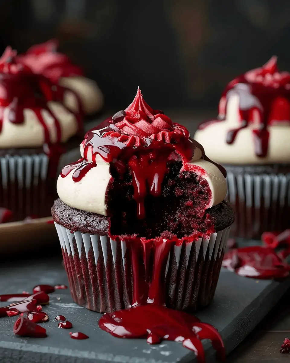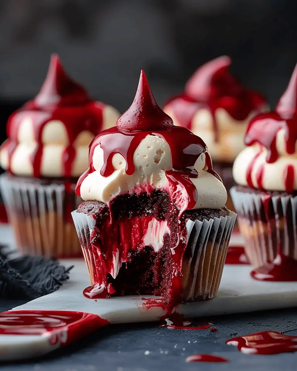 The magic of Halloween Vampire Bite Cupcakes lies in their charming appearance and delicious flavors. Imagine bite-sized chocolate cupcakes with a luscious raspberry filling that pops with a tangy sweetness. The chocolate frosting, decadently rich, contrasts beautifully with the red filling, making these treats eye-catching and Instagram-worthy.