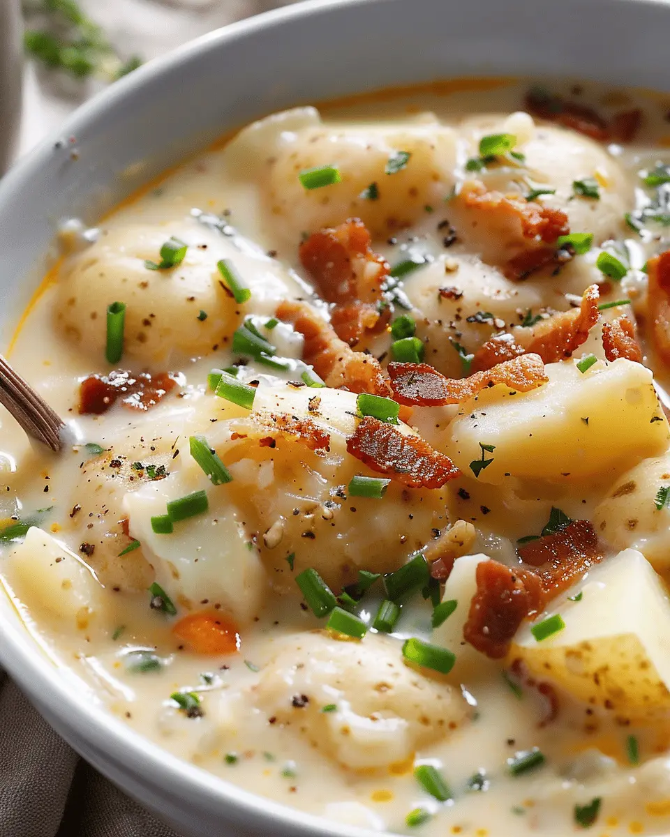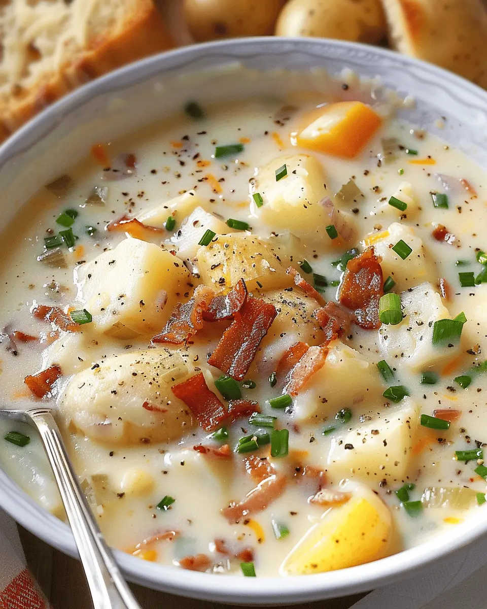 A delicious and comforting potato soup featuring creamy texture and smoky turkey bacon.