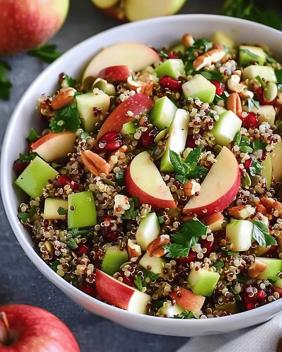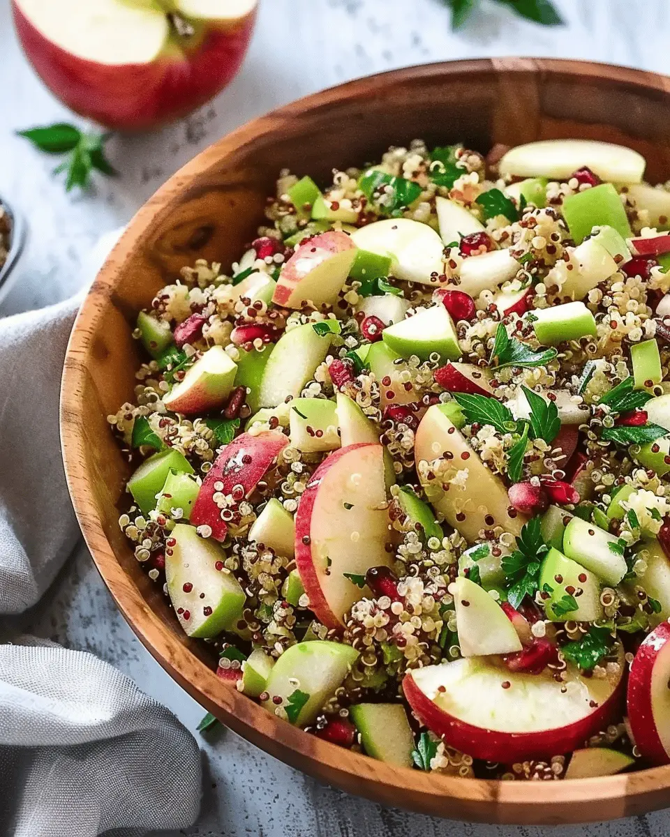 Now, consider the apples. Crisp, sweet, and in-season, they add a delightful crunch to your quinoa apple salad. Apples are rich in antioxidants and fiber, making them a great complement to quinoa, which helps in digestion and overall health management. A study from the Journal of Nutrition highlights that incorporating fruits like apples into your meals can enhance your satiety and reduce cravings for unhealthy snacks.