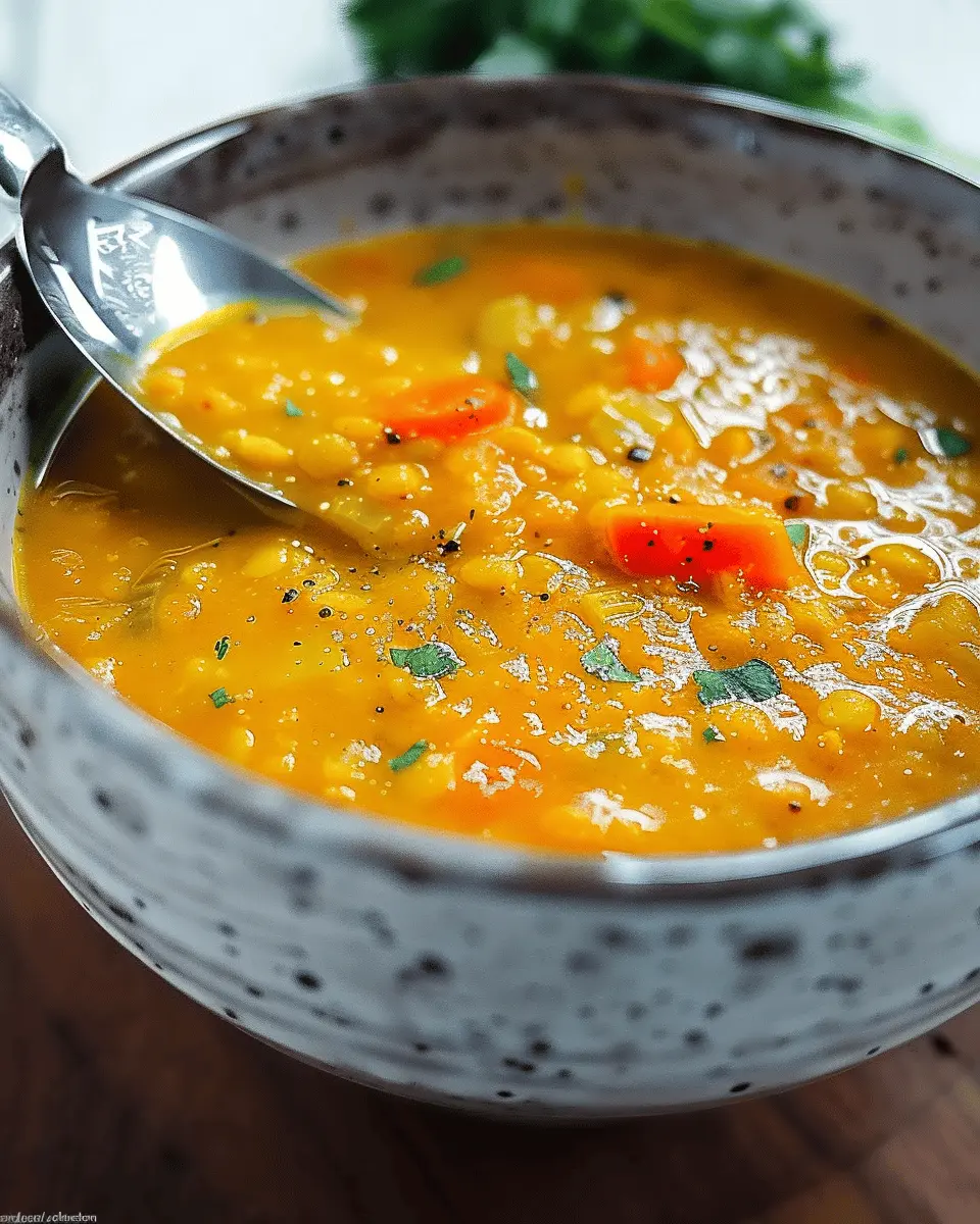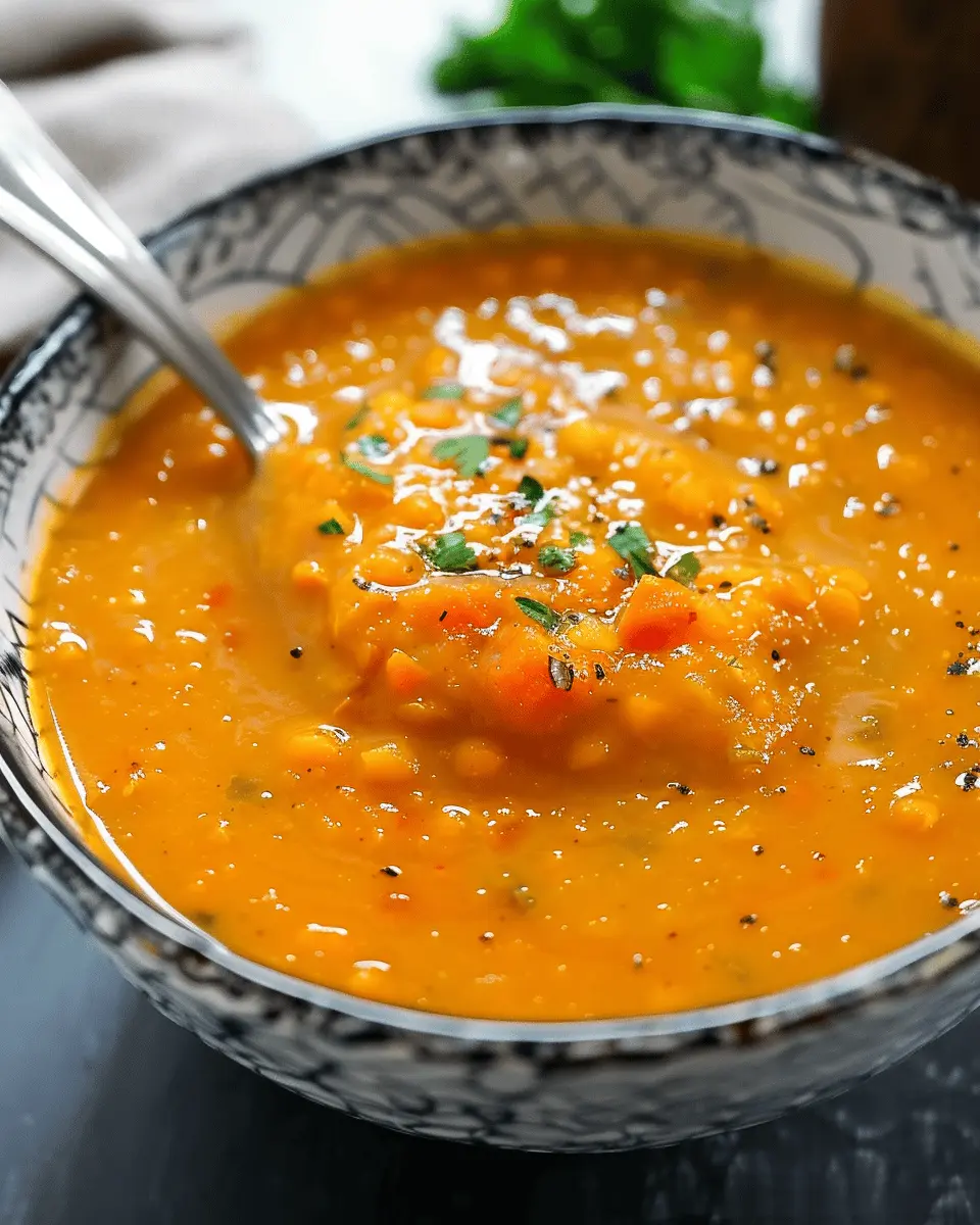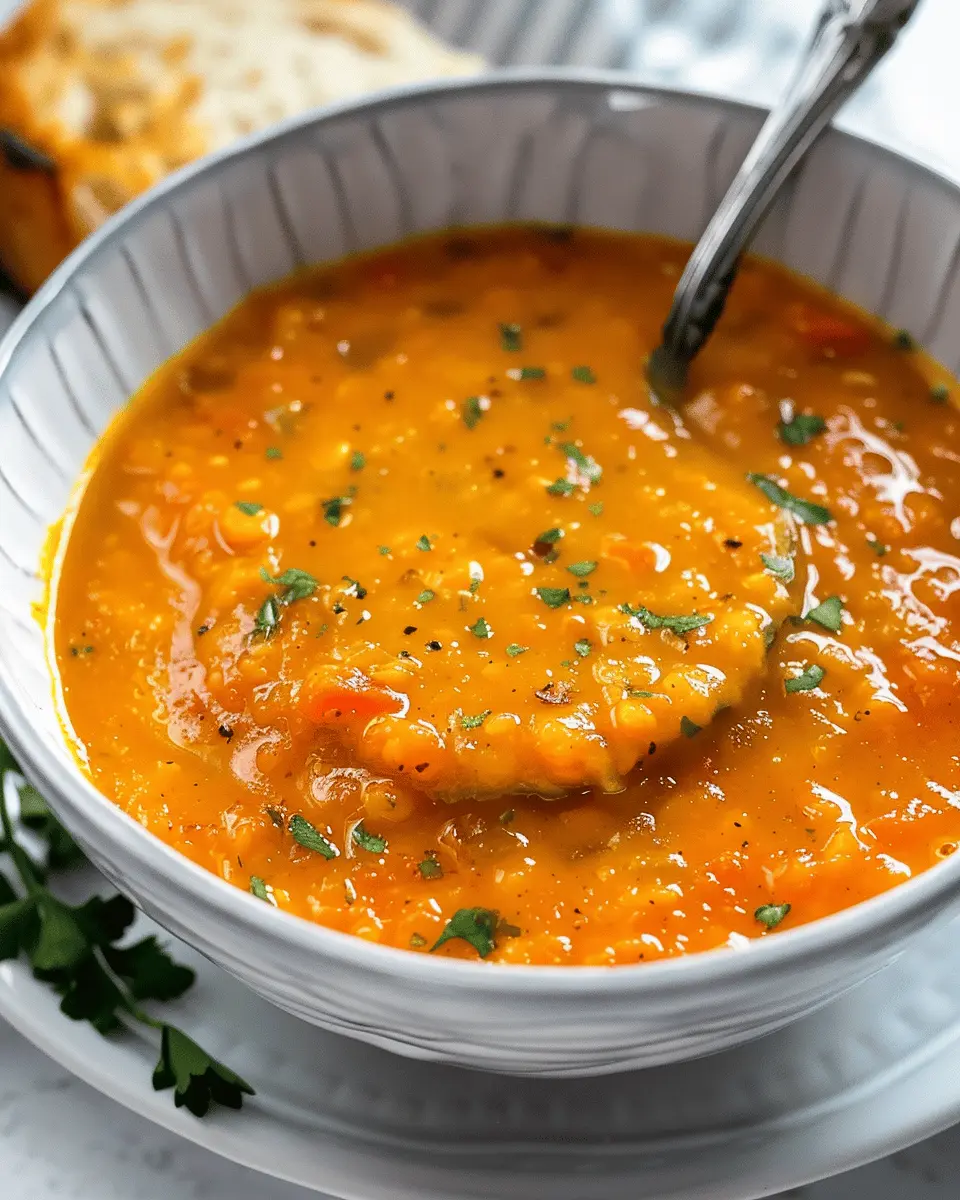 Enjoy a warm bowl of red lentil soup, packed with nutrients and comfort.