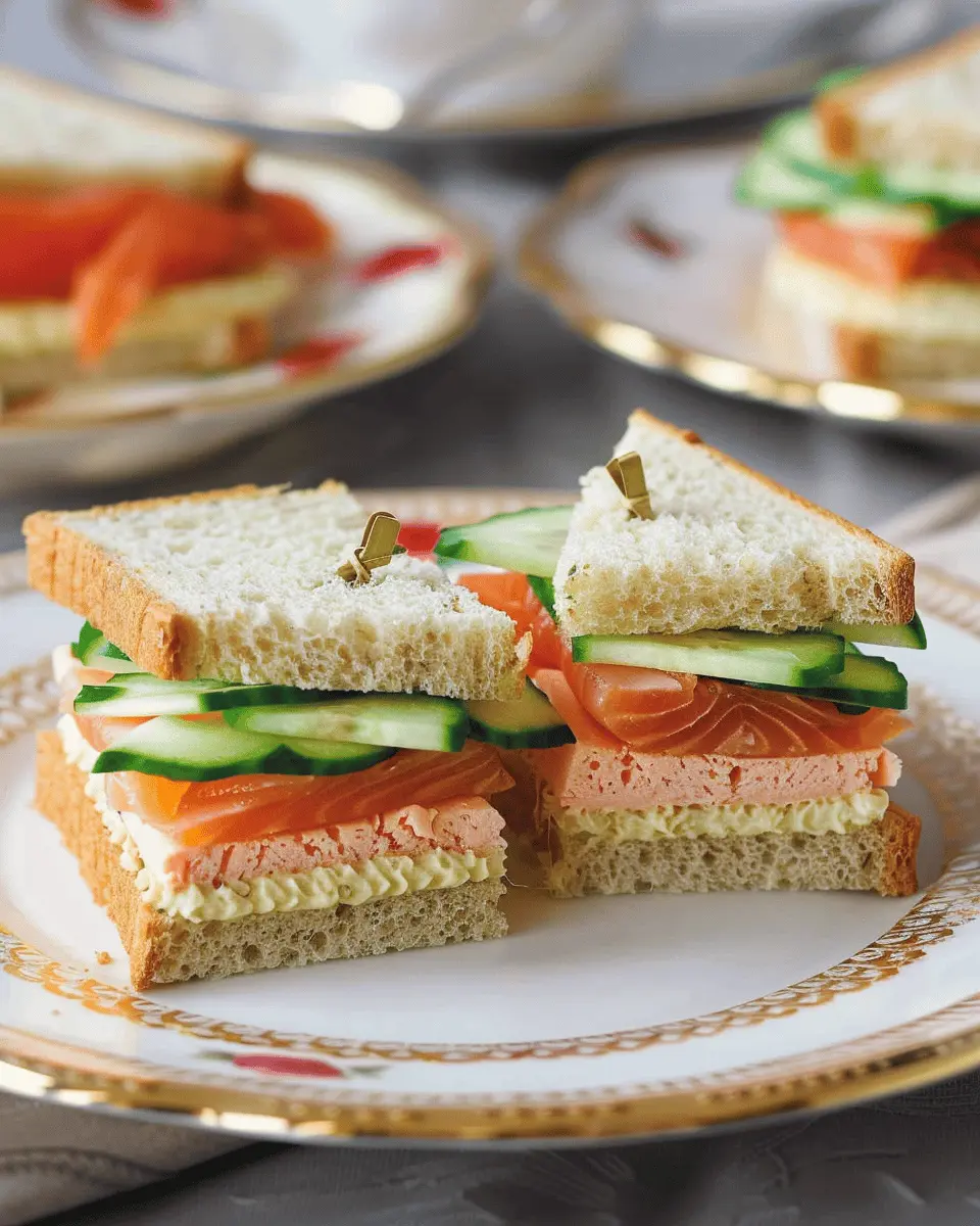 Experience the refined taste of smoked salmon paired with fresh cucumber and tangy pickled ginger in these elegant tea sandwiches.